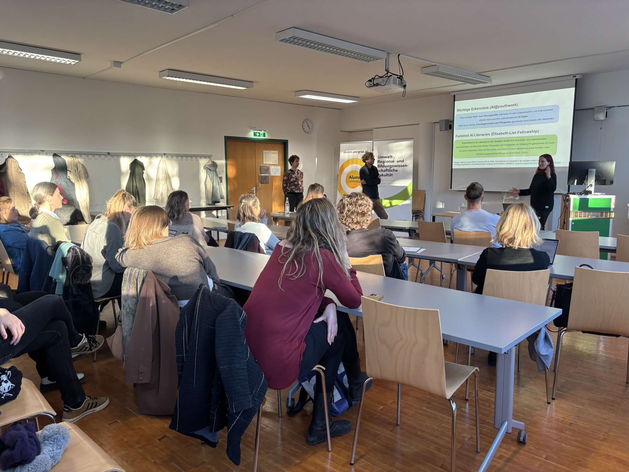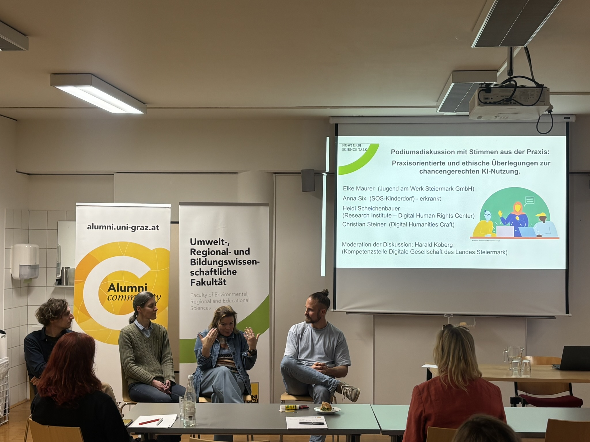 Nach einer Begrüßung durch Vizedekan Univ.-Prof. Dr. Markus Tilp gab es einen Vortrag von Sabine Klinger, Susanne Sackl-Sharif (Institut für Erziehungs- und Bildungswissenschaft) und Christian Steiner (Digital Humanities Craft) "Zur ambivalenten Nutzung von Künstlicher Intelligenz in der Sozialen Arbeit aus einer geschlechter- und diversitätsreflektierenden Perspektive." Anschließend fand einer Podiumsdiskussion unter dem Titel “Praxisorientierte und ethische Überlegungen zur chancengerechten KI-Nutzung.” statt. Elke Maurer (Jugend am Werk Steiermark GmbH), Christian Steiner (Digital Humanities Craft) und Heidi Scheichenbauer (Research Institute – Digital Human Rights Center) diskutierten unter der Moderation von Harald Koberg (Kompetenzstelle Digitale Gesellschaft des Landes Steiermark) über konkrete Erfahrungen, Herausforderungen und Handlungsmöglichkeiten im Umgang mit KI-Technologien in ihrer täglichen Praxis. Im Dialog zwischen Praxis und Wissenschaft loteten wir gemeinsam aus, wie der Einsatz von KI in der Sozialen Arbeit zu mehr Chancengerechtigkeit beitragen kann und welche ethischen Aspekte dabei berücksichtig werden sollten.